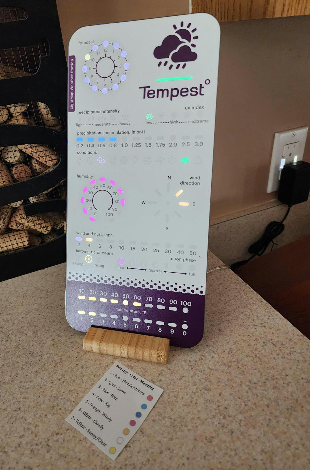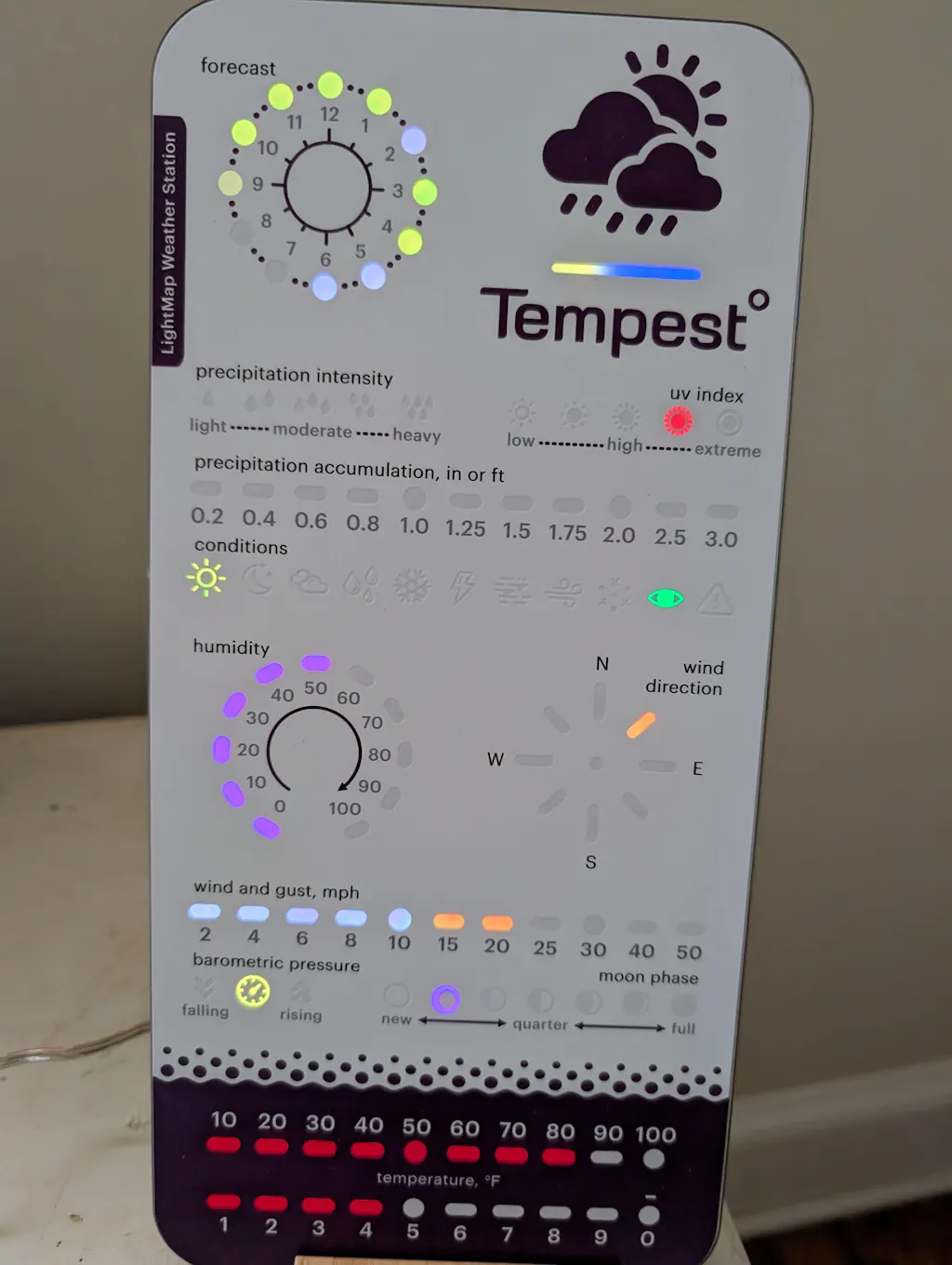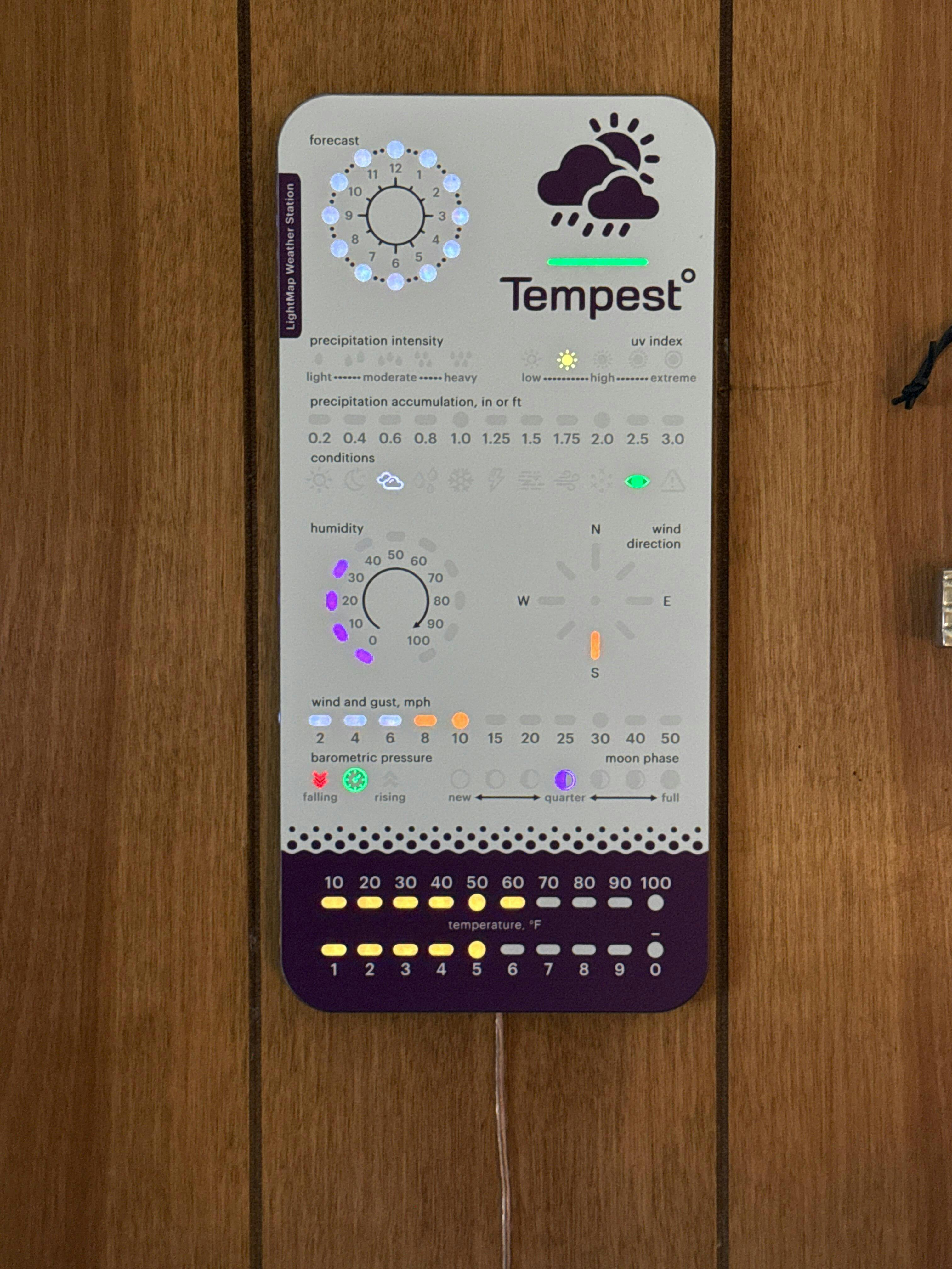 LightMap’s Weather Display transforms your Tempest weather data into a dynamic, colorful display - a fun and visually striking way to track changes in temperature, wind, and more.
