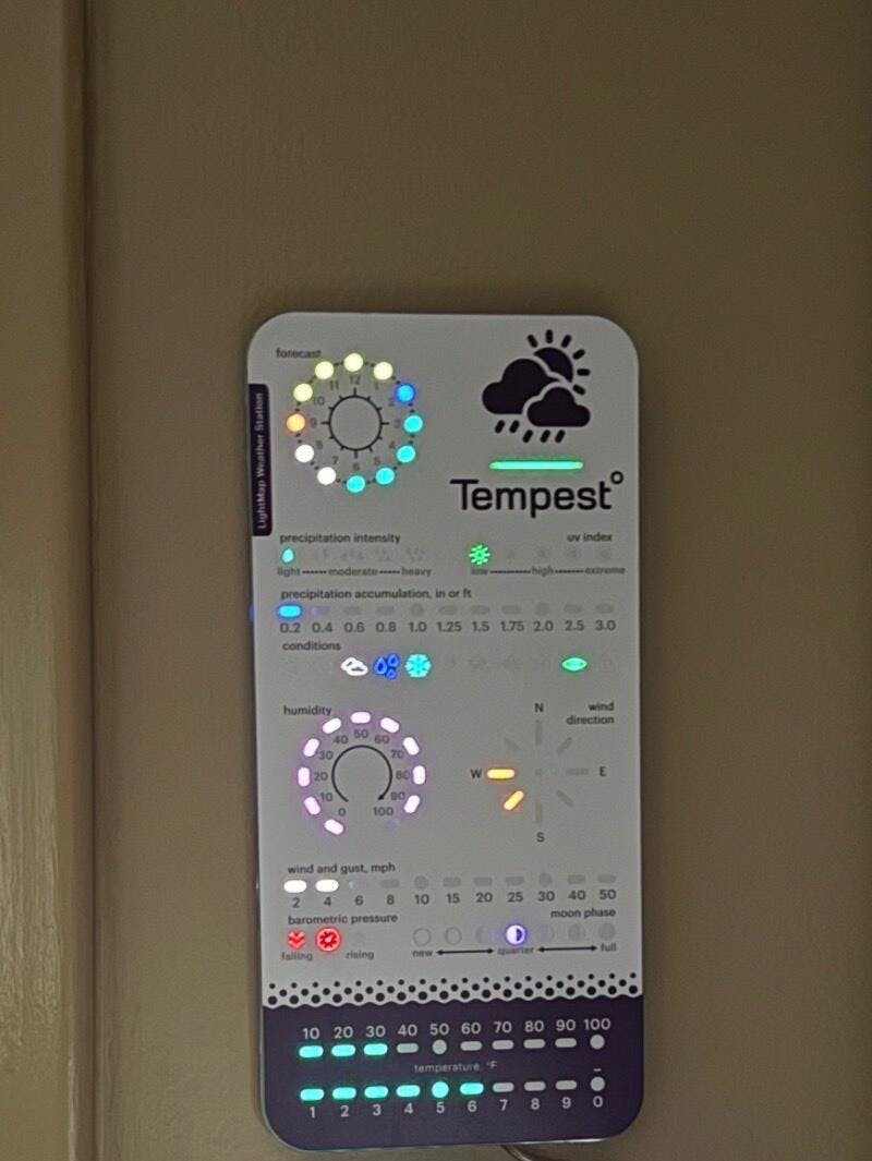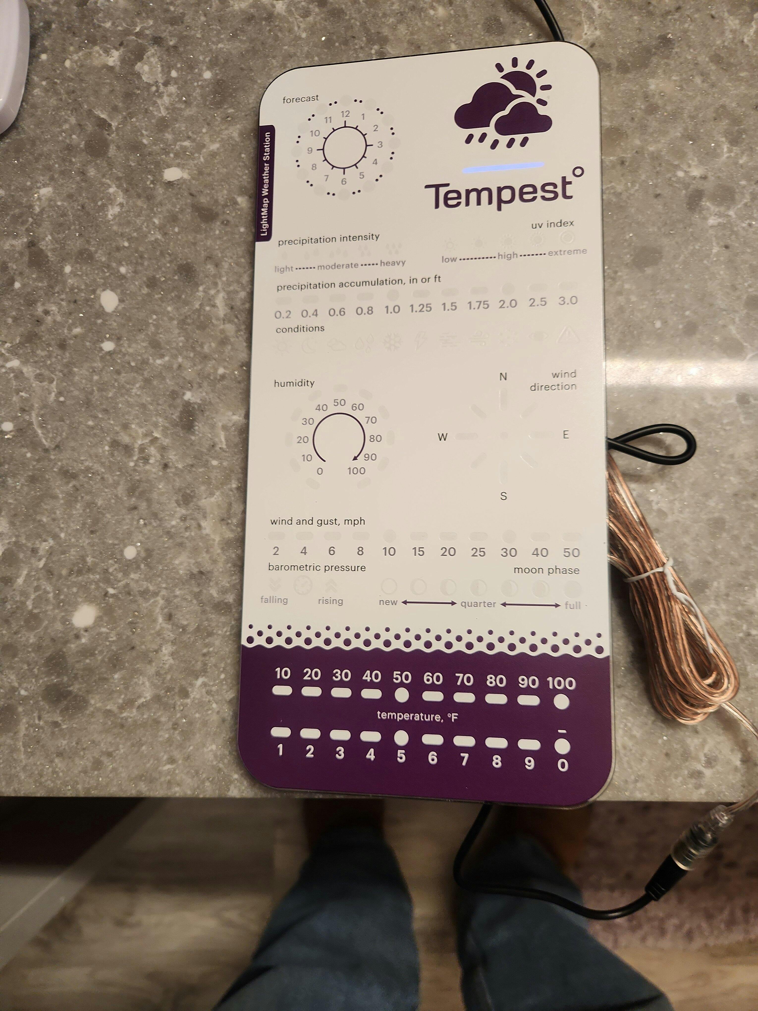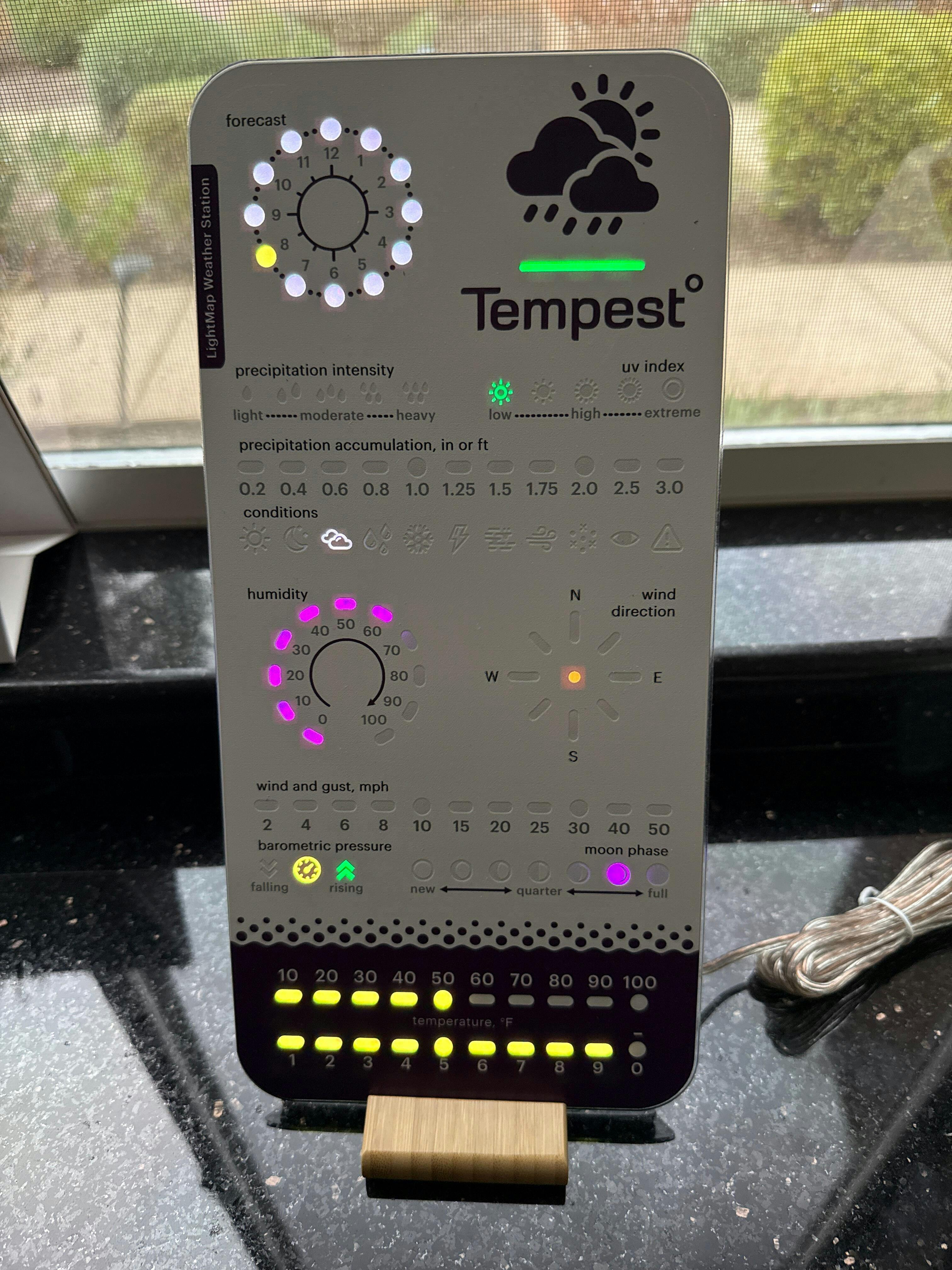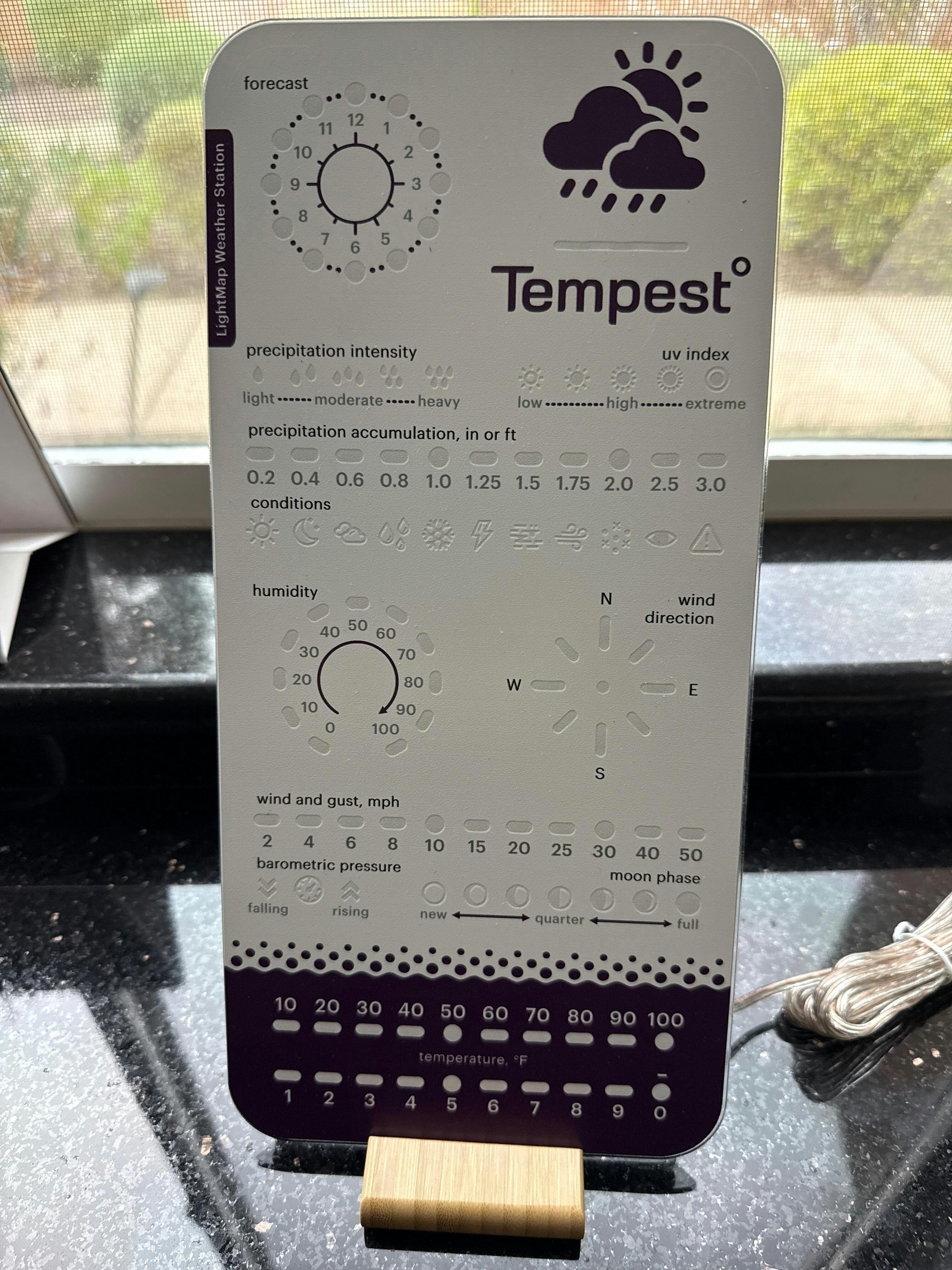 LightMap’s Weather Display transforms your Tempest weather data into a dynamic, colorful display - a fun and visually striking way to track changes in temperature, wind, and more.