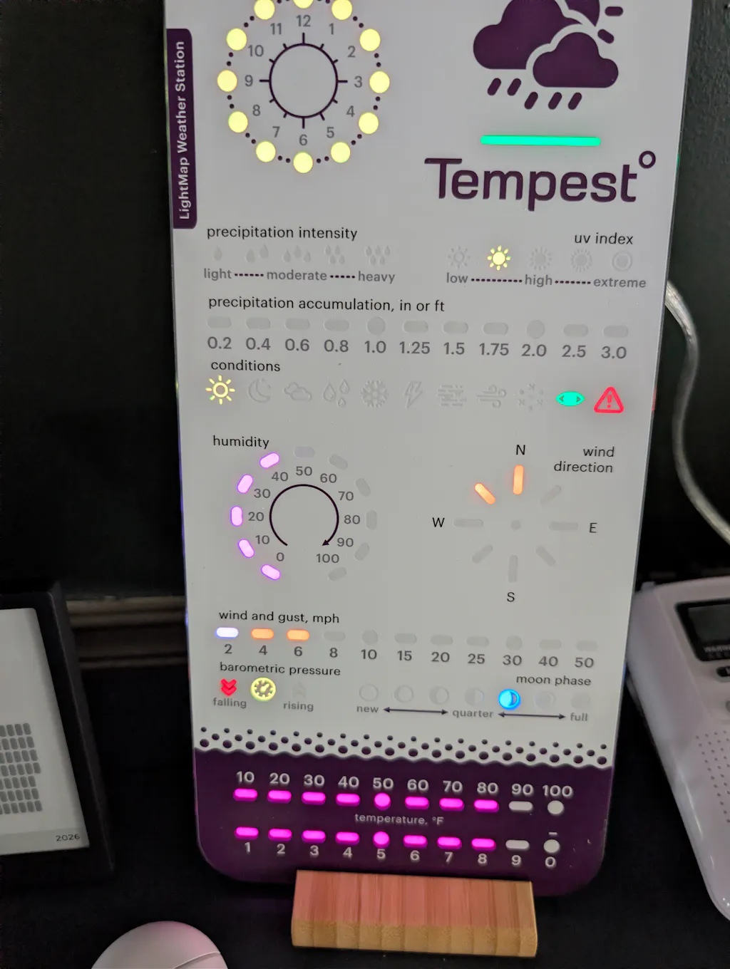 LightMap’s Weather Display transforms your Tempest weather data into a dynamic, colorful display - a fun and visually striking way to track changes in temperature, wind, and more.